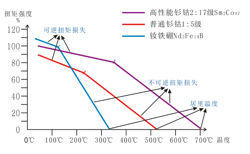 當(dāng)溫度超350℃,高性能釤鈷材質(zhì)的磁鋼將會(huì)進(jìn)入不可逆扭轉(zhuǎn)損失。