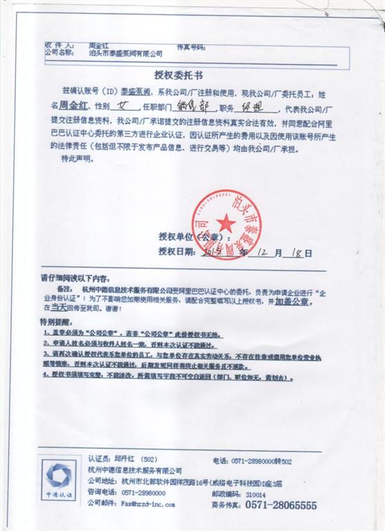 泰盛泵閥公司為了更進(jìn)一步打造出自己的“齒輪泵行業(yè)_泰盛”品牌。在2014年12月19日通過了阿里巴巴第三方的企業(yè)身份認(rèn)證,認(rèn)證中心對我公司提交的的所有泰盛泵閥資料信息合法有效。這是泰盛公司加蓋公章并簽字的認(rèn)證書合同。